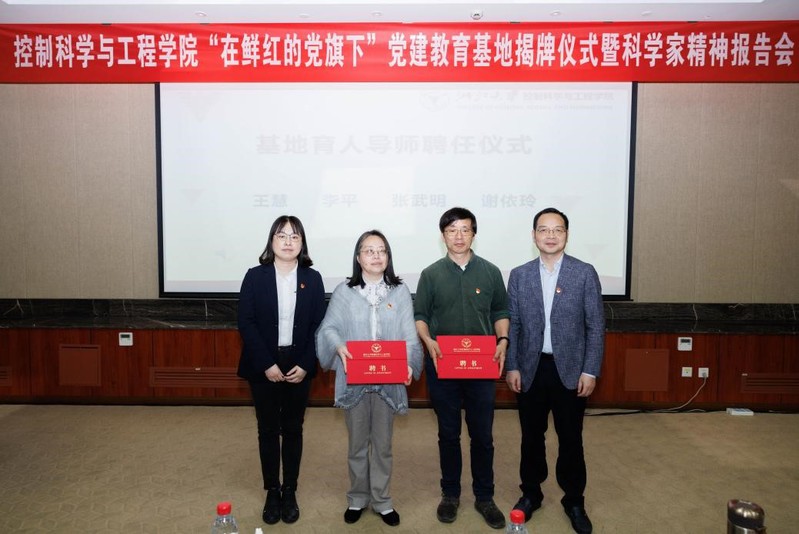 校关心下一代工作委员会副主任、求是宣讲团成员张孙玮,求是宣讲团成员庄表中,党委学生工作部副部长张园园,离退休工作处副处长兼离休党工委副书记陈立明,学院党委书记叶松共同为控制科学与工程学院“在鲜红的党旗下”党建教育基地揭牌。张园园、陈立明还为基地育人导师代表张武明、谢依玲颁发聘书。